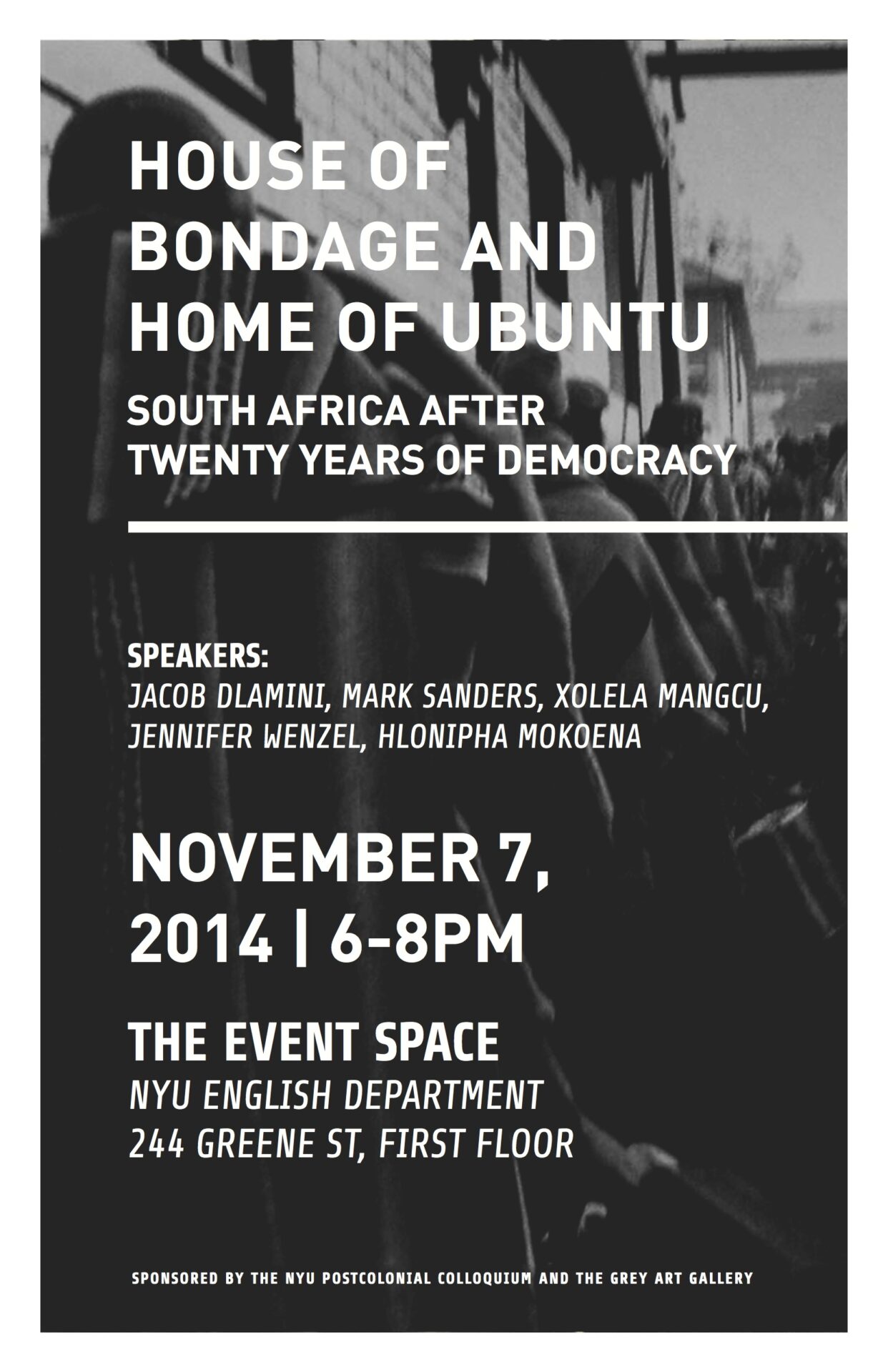 The colloquium seeks to address the following questions: If ubuntu refers to an African sense of ethics expressed in the idiom “umntu ngumntu ngabantu” (Xhosa)/ “umuntu ngumuntu ngabantu” (Zulu) (“a person is a person through other people”), what relationships or dissonance can be traced between the continuing structures of oppression exposed in Cole’s House of Bondage (New York: Random House, 1967) and South Africa as home of ubuntu? How does the idea of ubuntu appear through the lens of black intellectual traditions in South Africa, and can black intellectual traditions themselves be understood through the lens of ubuntu? How are dispossession and unfreedom in South Africa being framed and understood? To what extent can the humanities and social sciences work beyond exclusionary Western or European conceptualizations of humanism or “humanness”, without reifying or romanticizing what Achille Mbembe has called “the nativist reflex”? To what extent do South African issues speak to the rest of the world, particularly to the United States?